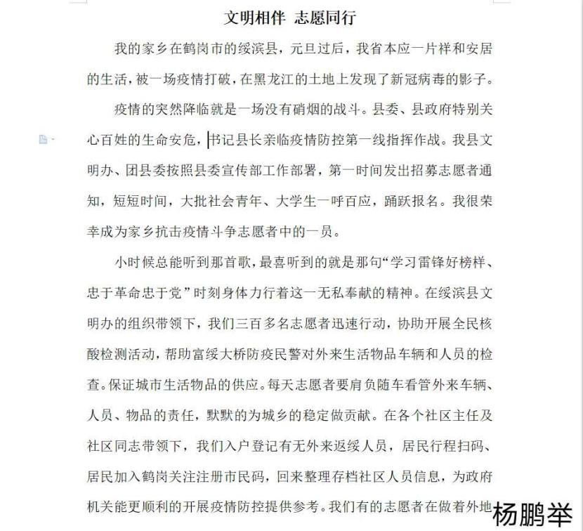 面对疫情严峻形势,我院65名学生,积极响应号召,主动请缨,参与到防控疫情中来,加入到防控疫情的志愿者队伍中,用实际行动诠释了自己的青春本色,为我院增光添彩。此次活动以投稿比赛形式借文章表达自己在此次疫情中志愿服务获得的感悟,参赛作品要求健康、积极向上、主题明确、内容丰富、有独到之处、感染力要强,抒发真情实感。此次活动同学们积极响应,纷纷来稿,充分的表达了自己的真情实感。经过微信小程序投票和专业老师评分。最终获奖人员名单如下一等奖:陈璐瑶,二等奖:王艺樾、杨鹏举,三等奖:武同庆、齐瑞雪、刘馨,优秀奖:于洋、曹欣欣、刘美宁、杨鑫月、武世宇。