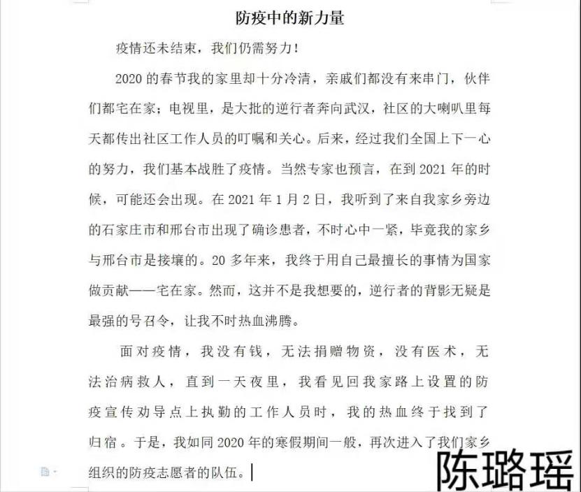 为弘扬爱国主义,唱响青春奋斗主旋律。增强学生的民族自豪感和自信心,强化学生担当意识,引导学生践行社会主义核心价值观、提高人文和健康素养,丰富假期生活,威廉希尔官网于1月28日起开展““疫”无反顾,志愿同行”线上征文活动,威廉希尔官网全体学生积极参与。