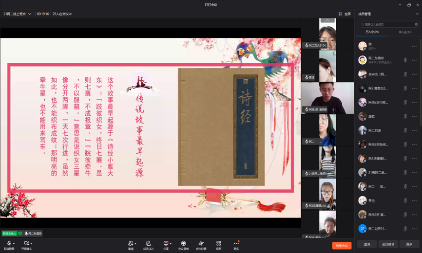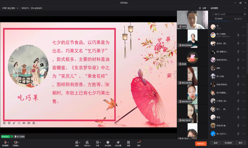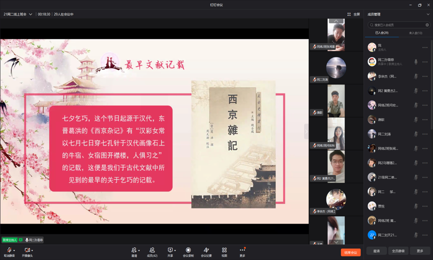 七夕节,又名乞巧节、七巧节或七姐诞。牛郎与织女的传说让七夕节多了一份浪漫。为让同学们深入了解七夕节的由来、习俗以及美好寓意,威廉希尔官网通过线上钉钉会议的形式来为大家进行科普。