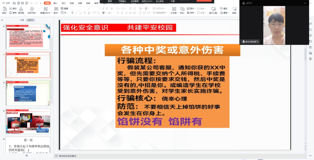 本次主题班会活动的顺利开展,增强了同学们的安全意识和自我保护能力,让同学们在面对安全问题时能真正做到警于思、合于规、慎于行,同时也为营造和谐有序的校园氛围、推动平安校园建设打下了良好的基础。