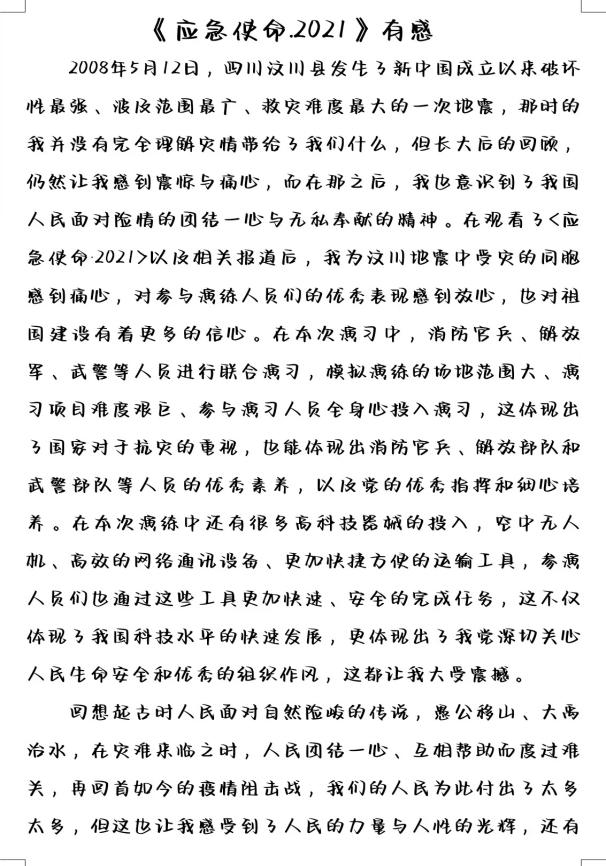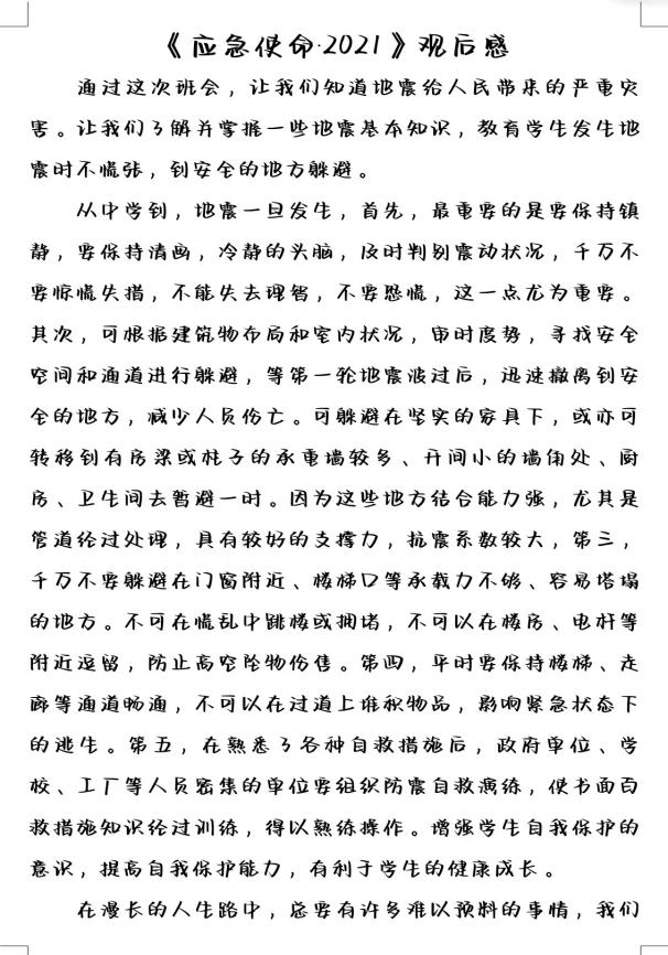 各班级还组织学生们开展了钉钉线上会议,带领大家共同观看《应急使命·2021》 抗震救灾演习电视专题片,唤起同学们对防震减灾工作的高度关注,进一步增强了同学们灾难风险防范意识和安全意识。会议结束之后,威廉希尔官网的学生们纷纷交流自己的感悟,并写下了自己的心得。