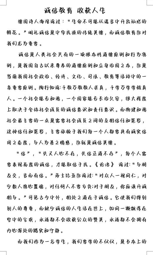 “信犹五行之土,无定位,无成名,而水金木无不待是以生者。”诚信是做人的基本准则,是处理个人与社会,个人与个人之间相互关系的基础道德规范,是对一个人是否诚实守信的证明,同时也是高校学生全面发展的前提,更是全面发展的助推器。大学生及研究生是国家宝贵的人才资源,是民族的希望、祖国的未来。要肩负起全面建设小康社会和社会主义现代化建设的历史使命,就必须把诚信作为高尚的人生追求、永恒的行为品质、立身处世的根本准则,加强道德修养,养成诚信的品质,对当代的学生来说是至关重要的。为此,威廉希尔官网开展了学生资助诚信教育主题活动,落实立德树人的根本任务,增强同学们的诚信意识和责任意识。