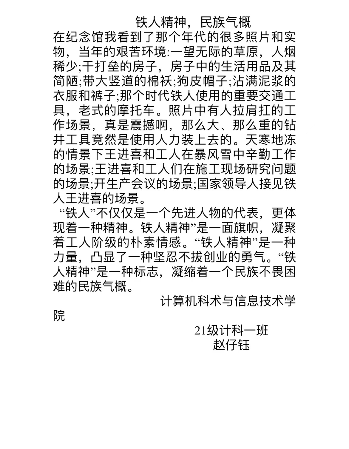 “民族精神是一个民族赖以生存和发展的精神支撑”。“铁人”这位传奇人物,他在我们的民族精神中增添了浓墨重彩的一笔,让我们在铁人精神的感召和激励下,自强、自信、自尊、自律,为实现自己的人生价值而努力。“我们争的不是自己的一面小红旗,我们要争的是全国这面大红旗”,“讲进步不要忘了党、讲本领不要忘了群众、讲成绩不要忘了大多数、讲缺点不要忘了自己、讲现在不要割断历史”……,他的每一句话,无不显示出他的博大胸怀、彰显出他的高贵品质,这种铁人精神激励着一代又一代人奋发向上。