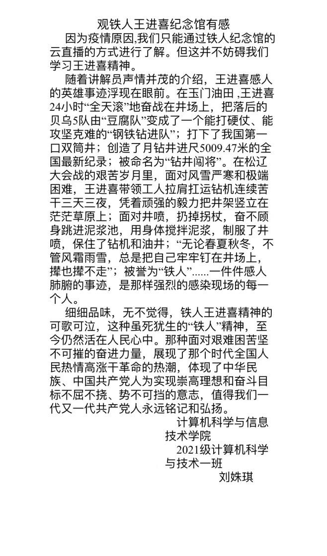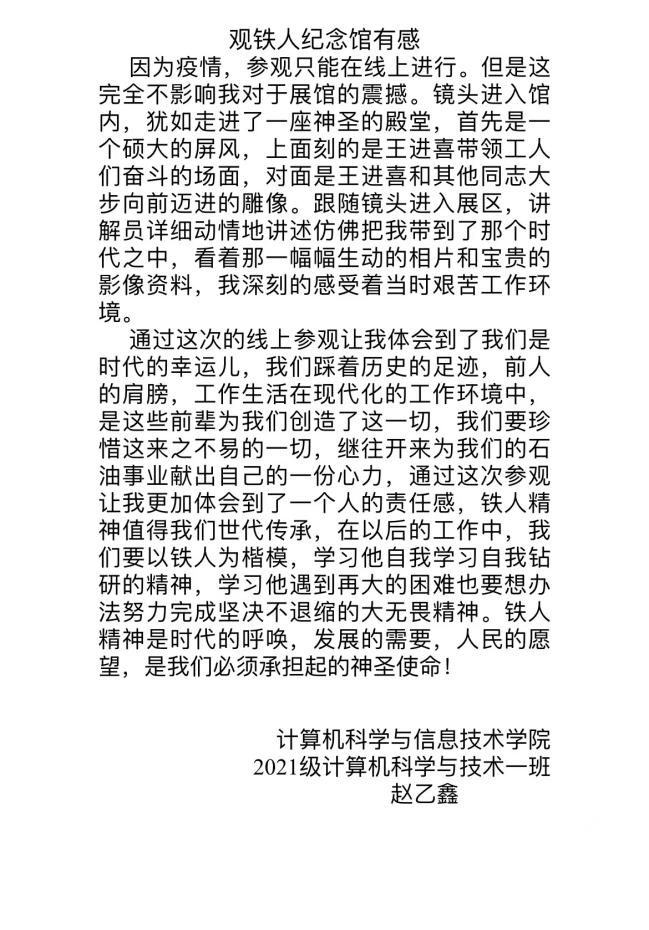云直播结束后,同学们纷纷撰写了参观铁人纪念馆的心得体会。铁人精神已经成为中华民族伟大精神的重要组成部分,永远是激励中国人民不畏艰难、勇往直前的宝贵精神财富。大家表示,一定会结合自身实际学习铁人不畏艰险、勇于担当、艰苦朴素、关爱他人的精神和品质,把“不忘初心,牢记使命”主题教育不断引向深入,精益求精,再创佳绩。