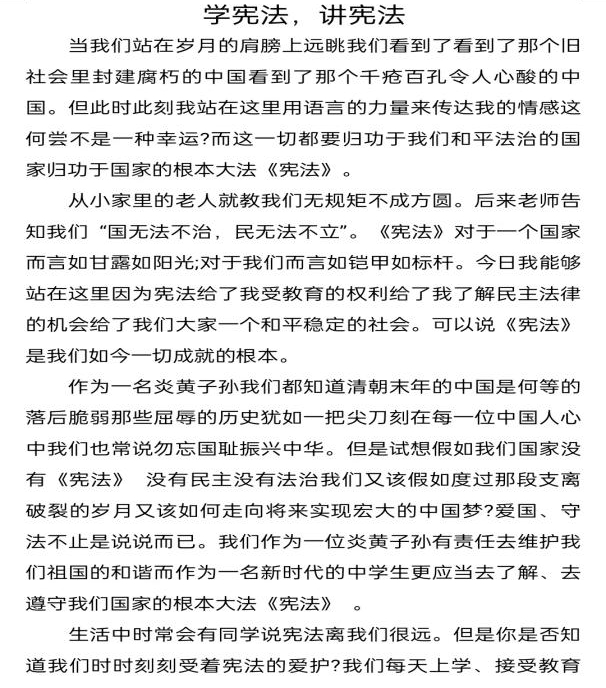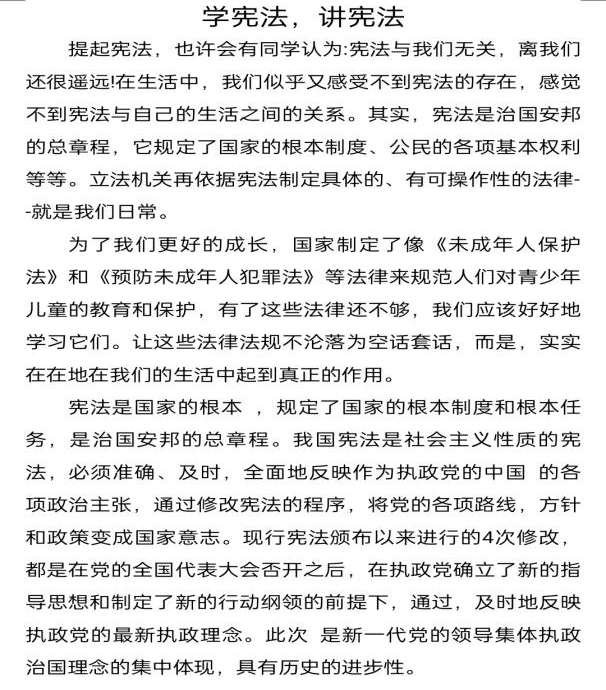 在征文中,同学们也表示:作为一名大学生,会以实际行动学习并贯彻宪法的精神,自觉做宪法精神的弘扬者,宪法实施的推动者,真正做到学宪法,讲宪法,懂宪法!