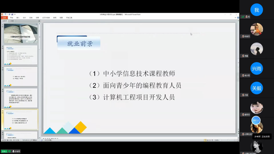本专业由我院许有军老师作为主讲人对新生进行专业介绍。许老师强调计算机科学与技术是研究整个计算机的生态系统,包括硬件、软件、网络,总言之是一个大而全的专业,所以学习偏理论,系统性强。它也是一个比较传统的计算机专业,开设计算机学院的高校一般都有这个专业。除此之外,许老师介绍了本专业的课程体系、培养目标以及就业前景。