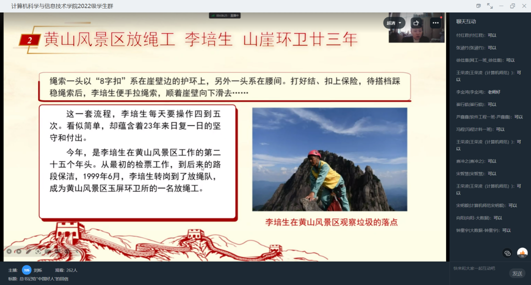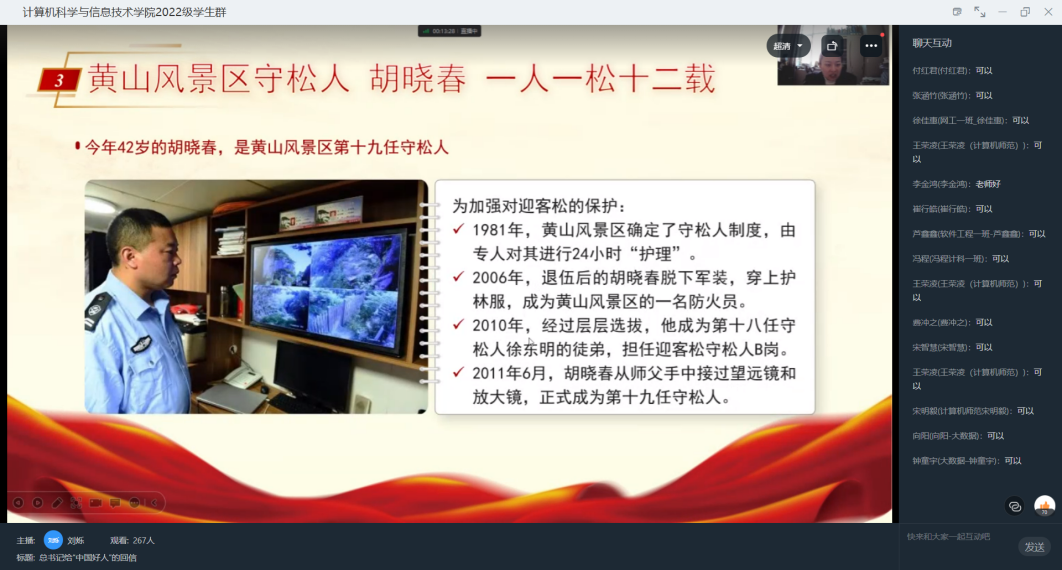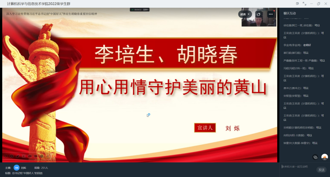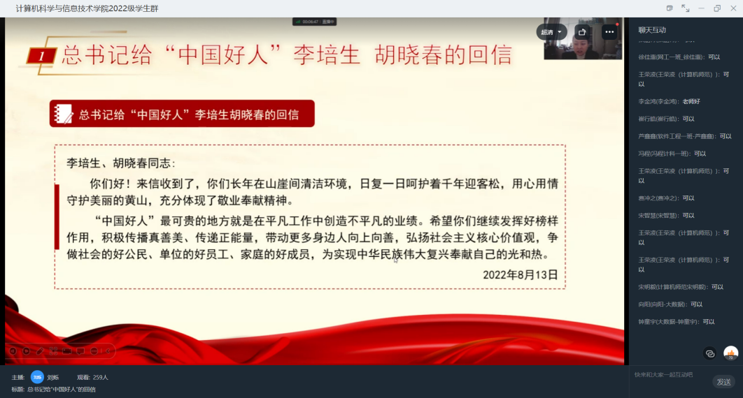 深入学习宣传贯彻习近平总书记重要回信精神,充分发挥身边榜样人物模范带头作用,领会感悟“中国好人”最可贵的精神品质,10月25日,威廉希尔官网召开“总书记给‘中国好人’的回信”主题会议,会议由2022级辅导员刘烁老师主持,通过线上形式激励计科学子,认真学习“中国好人”事迹,领悟“中国好人”精神,在李培生、胡晓春的积极影响下,完善自身品格修养,传播积极正能量。
