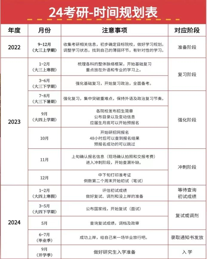 2024年考研并不是说在2024年考研,而是在2023年12月底参加初试,2024年4-5月参加复试,2024年9月入学。今年9月份开学大三的同学就属于24考研,可以开始了解考研的流程、目标专业和院校了。