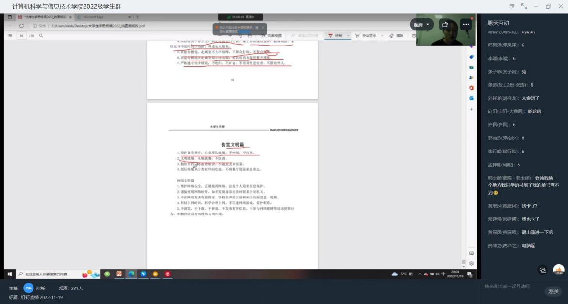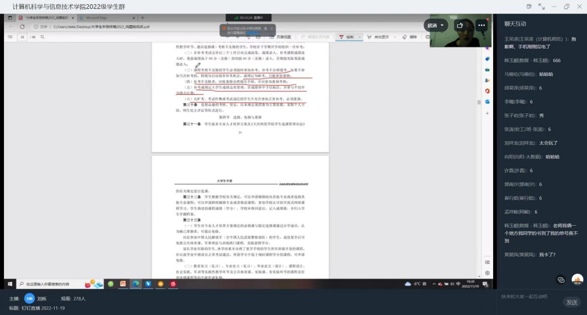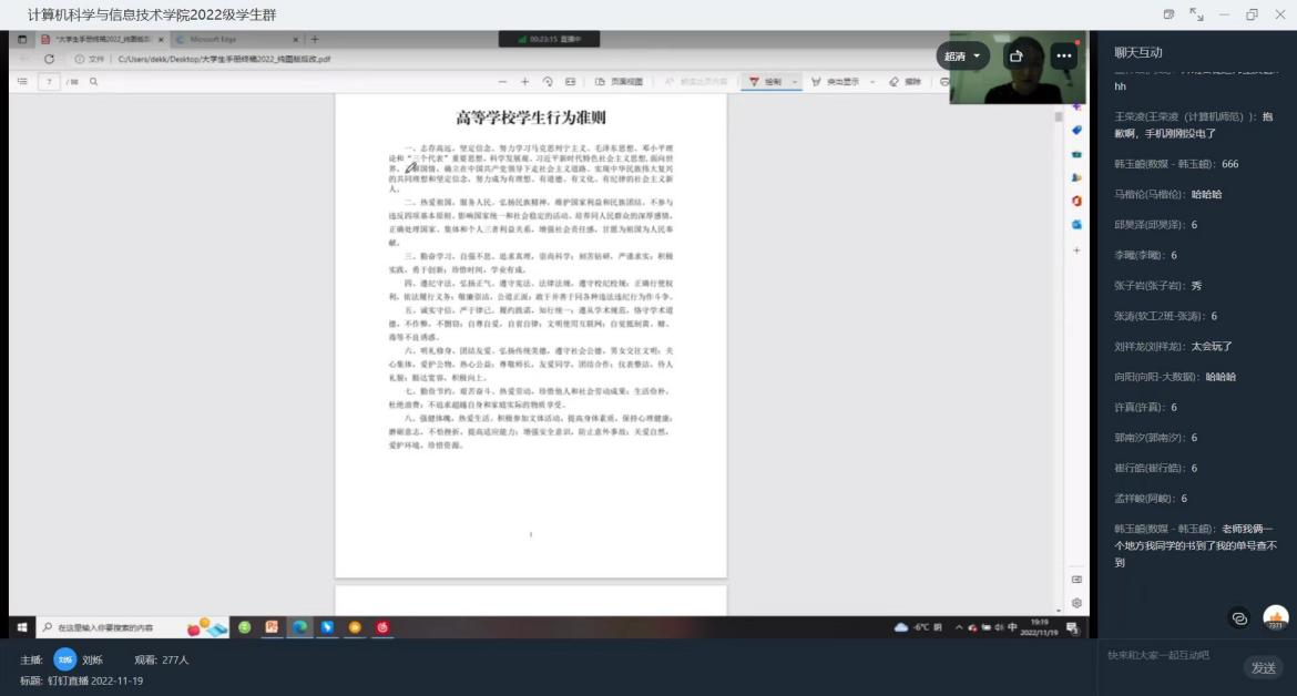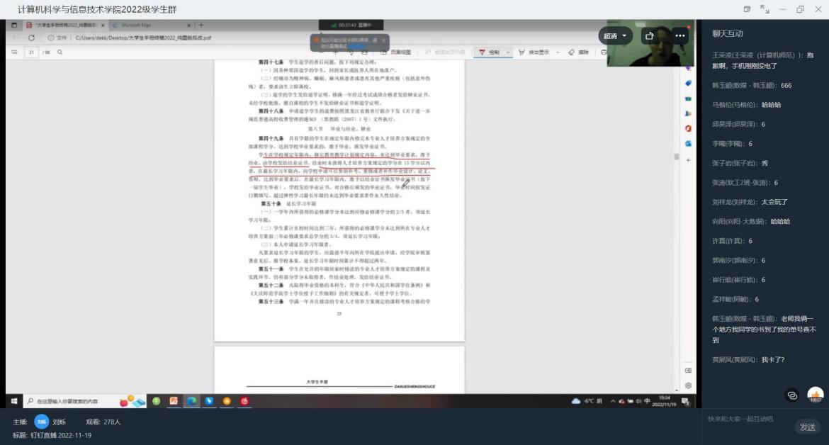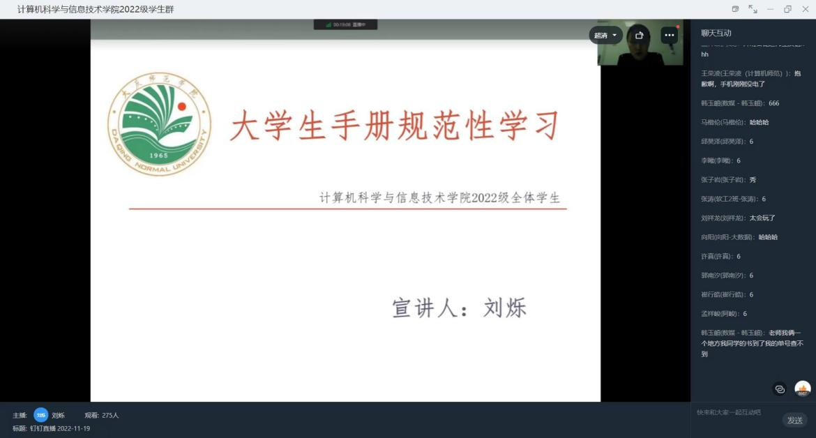 《大学生手册》的学习是新生入学教育中重要的一环,是学生更好地规划大学生活的保障。为进一步强化2022级新生自我规范和管理的意识,增强威廉希尔官网学风、校风、教风建设,促进学生德、智、体、美、劳全面发展。威廉希尔官网于11月19日开展大学生手册讲解线上会议,本次会议由22级辅导员刘烁老师主持。