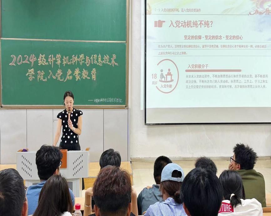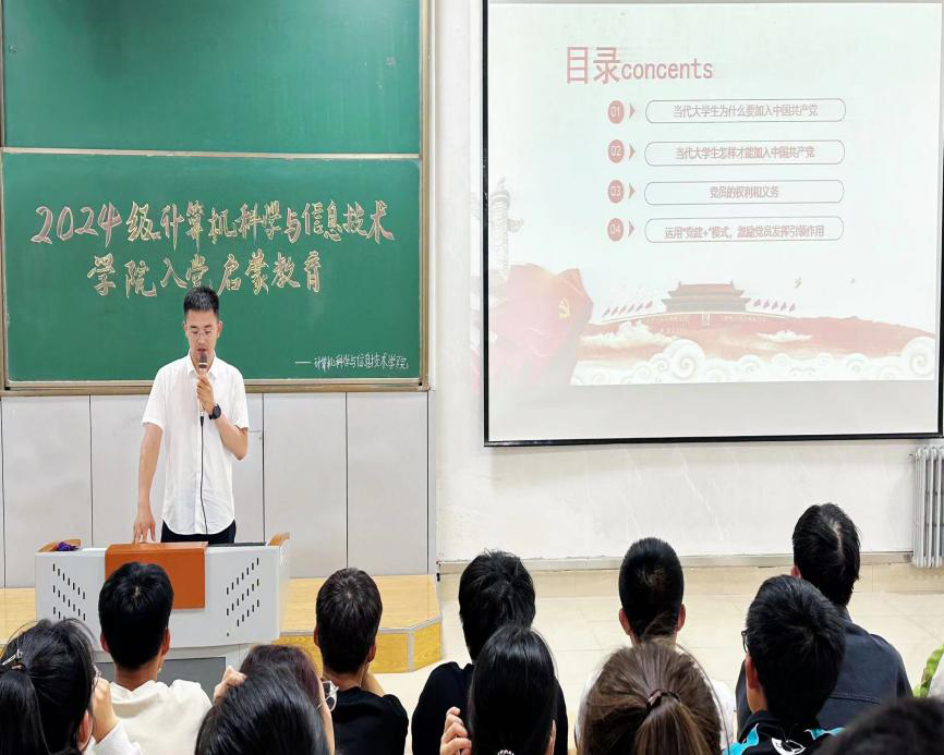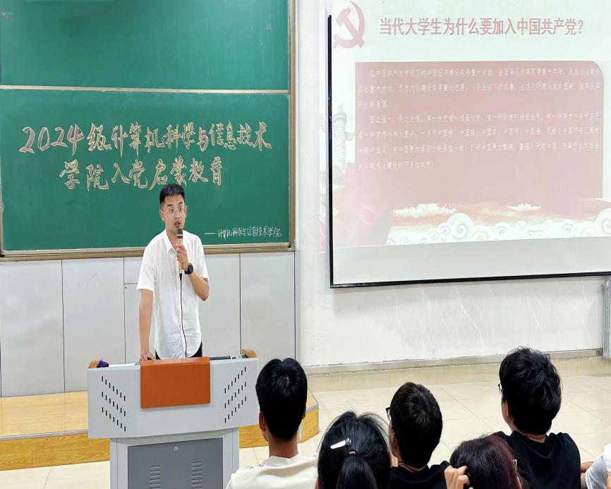 为深化大学生理想信念教育,号召新生积极向党组织靠拢,让新生了解入党基本流程和基本要求,9月10日,计算机科学与信息技术召开入党启蒙教育大会,2024级全体新生参加会议。会议由软件数媒学生党支部书记苏鸿鹏老师和计科网络大数据学生党支部书记刘烁老师共同主持。