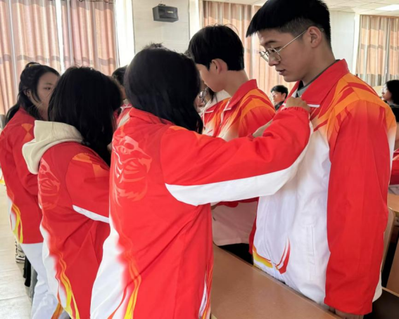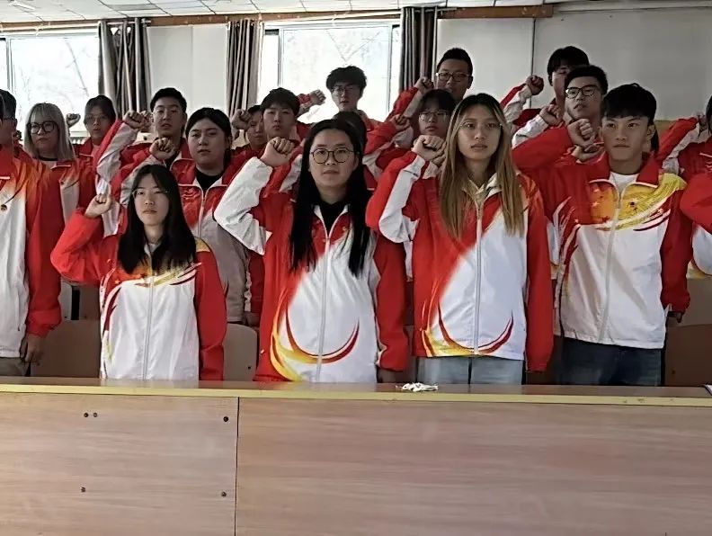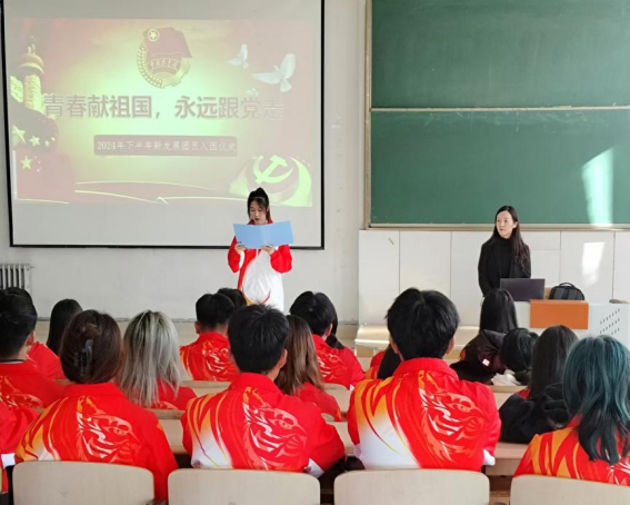 全体团员奏唱中国共产主义青年团团歌后,杨老师宣读新团员名单,优秀团员代表为新团员佩戴团徽。