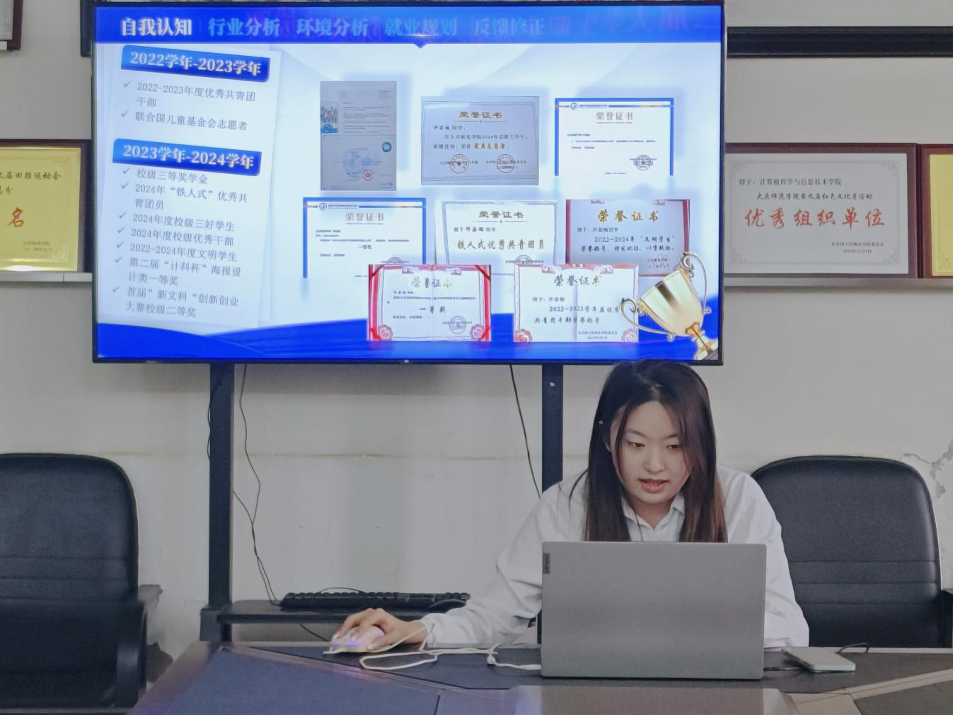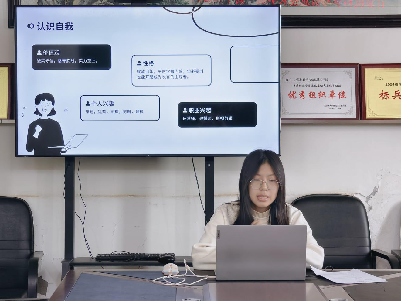 本次比赛共有八名选手参赛,他们分别是2022级学生贾昆阳、许茹楠、许真,2023级学生向烨,2024级学生赵安南、刘佳馨、徐郡潍、王宇航。由学院辅导员苏鸿鹏、杨小丽、刘烁、闫令文四位老师担任评委。大赛分为成长赛道和就业赛道。参赛选手们通过PPT展示和现场演讲的方式,详细介绍了他们的职业规划。选手们以各自职业目标为核心,深入剖析自身优劣势,并探讨行业发展趋势与市场需求动态等宏观因素。