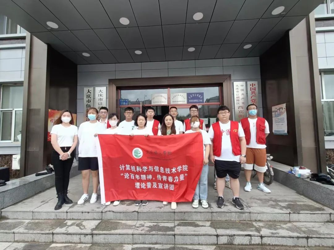 为深入学习宣传贯彻习近平新时代中国特色社会主义思想,贯彻落实习近平总书记关于青年工作的重要思想,引导和帮助广大青年学生上好“大思政课”,在社会课堂中受教育、长才干、做贡献,在观察实践中学党史、强信念、跟党走,努力成为担当民族复兴大任的时代新人,以实际行动庆祝中国共产主义青年团成立一百周年,按照学校上级和团中央《关于开展2022年全国大中专学生志愿者暑期文化科技卫生“三下乡”社会实践活动的通知》的要求,结合实际情况和疫情防控要求,由威廉希尔官网13名学子组成的“论百年精神,传青春力量”理论普及宣讲团,在学院团总支书记苏鸿鹏,2021级辅导员老师杨小丽的带领下,赴大庆市明湖社区开展理论普及宣讲活动。