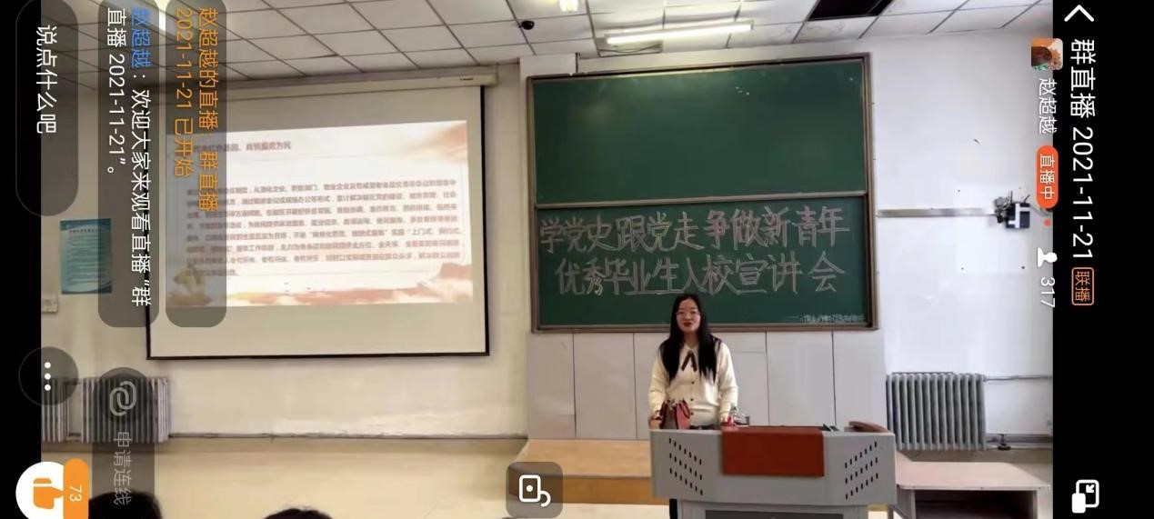 现任创业城街道创业八社区党支部书记的崔秀楠,在宣讲会上和同学们介绍了十九届六中全会的精神宣讲报告,并结合大学的切身体会,交流了思想、学习、生活和工作实践等方面的感受,向大一、大二的学弟学妹们传播青春的正能量,用亲身经历向即将踏入社会的大三学生传授实习就业的注意事项。