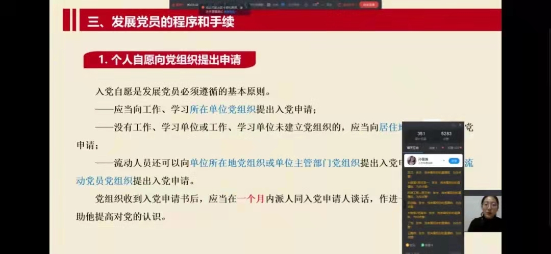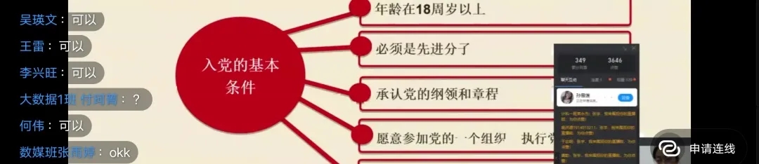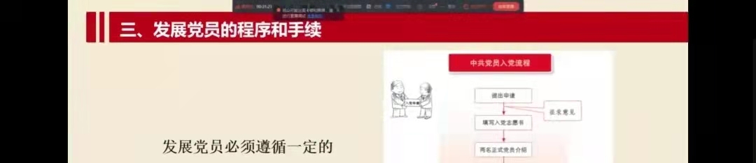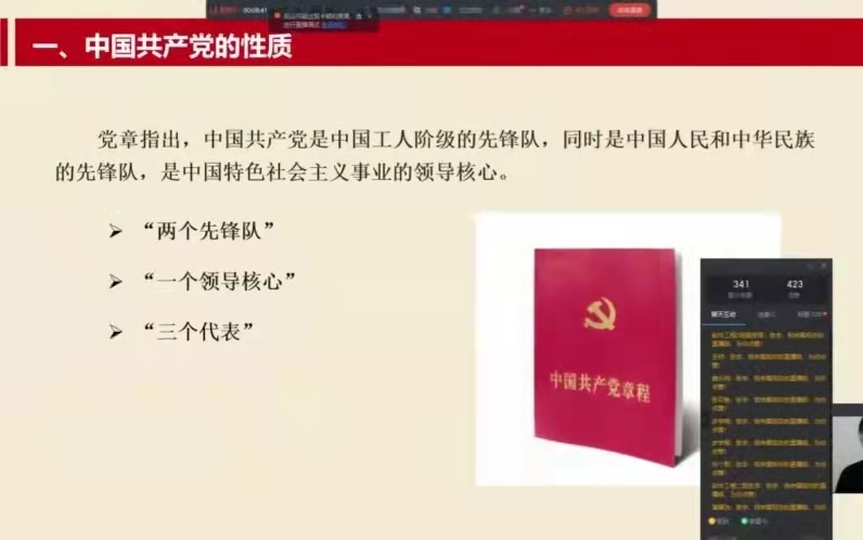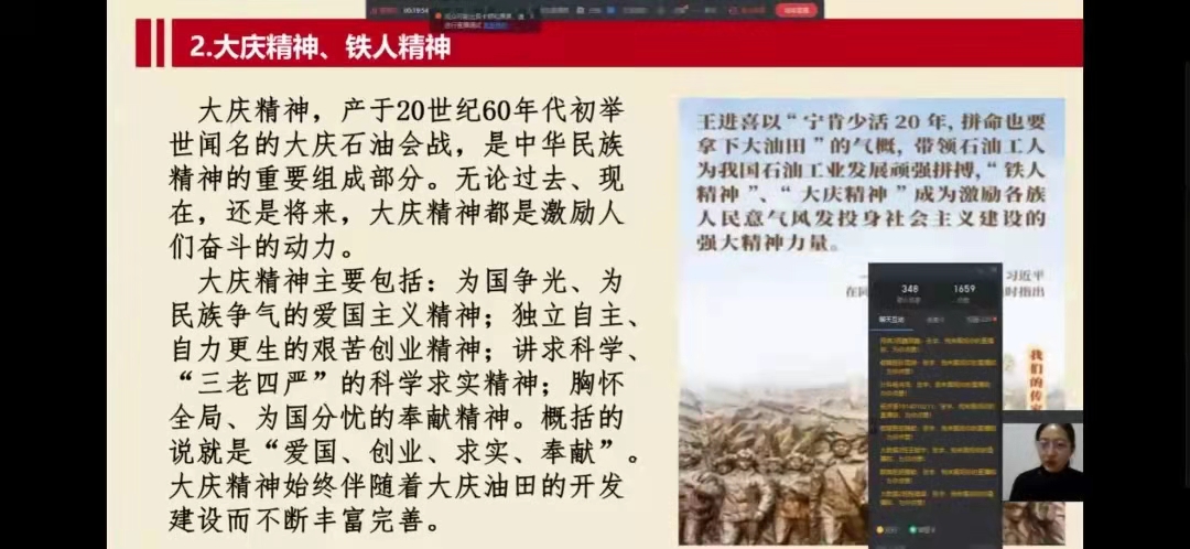 会议结合中国共产党党史、现状以及发展学生党员的相关规定,紧紧围绕着中国共产党是一个什么样的政党、我们为什么要加入中国共产党、我们怎样才能加入中国共产党三方面为同学们展开全面详细的介绍。为帮助本科同学尽快融入新学期生活,引领学生树立红色信仰,传承红色基因,威廉希尔官网开展新生入党启蒙教育活动,本次线上课程以“学史增信,继往开来”为主题,带领同学们学习习近平总书记在庆祝中国共产党成立100周年大会上的讲话精神,讲述大庆精神的内涵,铁人王进喜等老一辈石油人的先进事迹,激励同学们在新的历史条件下,心怀梦想,牢记初心使命,勇于担当作为,以艰苦奋斗践行无悔青春!学生党支部书记张宇在课程中强调了端正入党动机的重要性和必要性,她希望同学们结合所学专业和自身实际不断深化对中国共产党的认识,积极了解当前主题教育的背景和内容,努力跟进学院党总支最新政治方向,积极向党组织靠拢。张宇老师将理论与实际相结合,同学们听得津津有味。