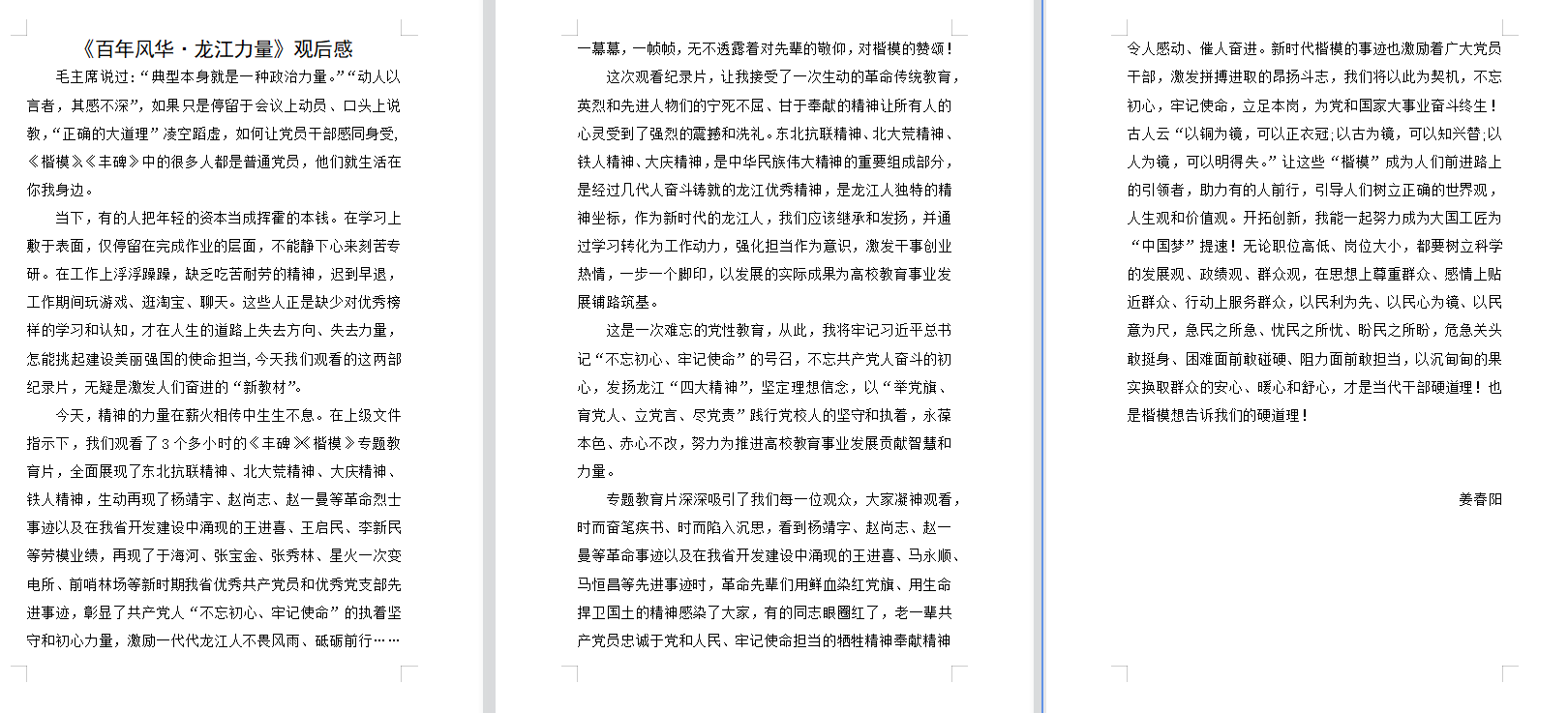 视频内容为黑龙江省在各个历史时期作出的独特性、重要性贡献,影片介绍了黑龙江省在革命和建设时期陆续形成的东北抗联精神、北大荒精神、大庆精神和铁人精神,这四大精神核心的内涵就是“爱国和奉献”,在四大精神的引导下,一代又一代龙江人不忘初心、牢记使命、高举旗帜、艰苦奋斗,为国家经济建设和改革开放作出了重要贡献,充分展示了黑龙江省在党的领导下走过的壮阔历程和取得的辉煌成就。观看视频后,威廉希尔官网全体党员表示将立足党的百年历史新起点,总结历史经验,把握历史规律,以榜样为标杆,以史为鉴,不忘初心,牢记使命,继续发挥党员先锋模范作用。在传承红色血脉中不断攻坚克难,努力践行党的初心使命;在重温历史中汲取信仰力量;在缅怀先辈中传承红色精神;在抚今追昔中激发昂扬斗志,为我校教育发展贡献力量!